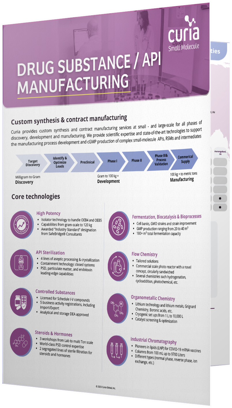 Curia has 12 GMP facilities across the US, France, Italy, Spain, and India, providing capacity where you need it. View our API and Drug Product facilities.