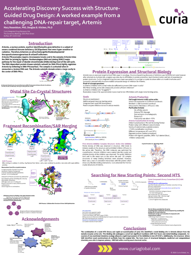 Download this poster to discover how our team of experts were able to produce the first crystal structure of a challenging but promising target, Artemis. The analysis of the 3D structure, in combination with high throughput screening, identified a novel binding site. Co-crystals of new medicinal chemistry analogs allowed a rapid improvement of the inhibition to low nM IC50’s. The Curia team of structural biologists, medicinal and computational chemistry was able to improve potency ~500 fold while creating novel chemical matter.